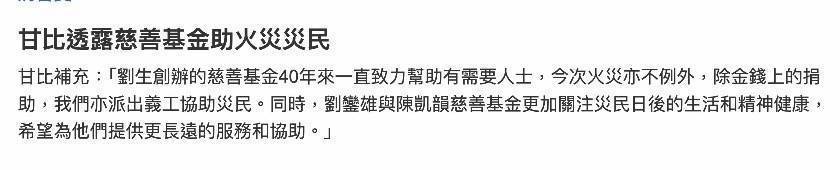 此次香港大火,不少东说念主质疑刘銮雄莫得捐钱。甘比成心发挥,刘銮雄创办的慈善基金会一直勤奋于匡助有需要的东说念主士。此次大火也不例外,除了财富上的捐助,他们还派出一共匡助灾民。