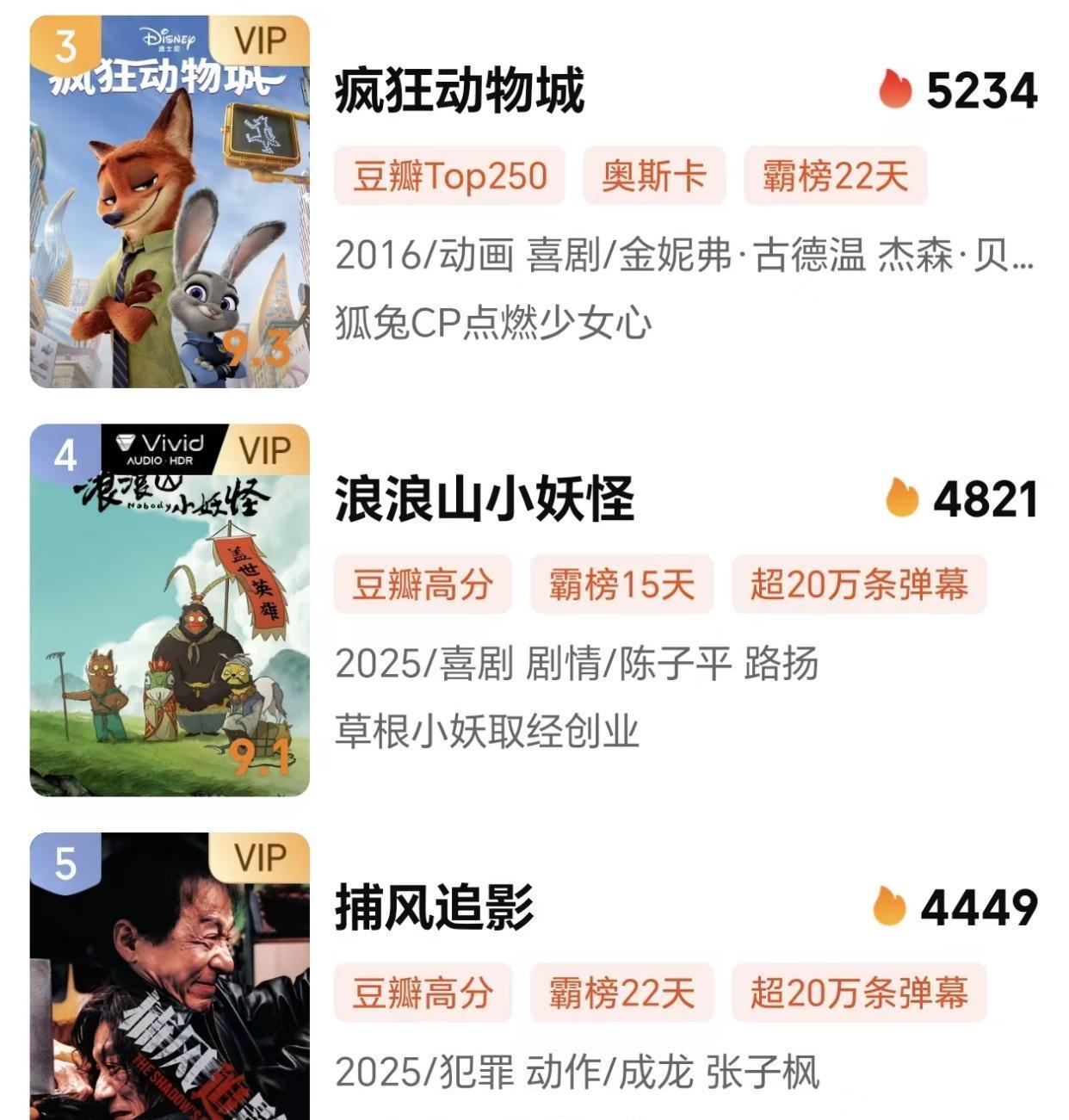 近十来天,迪士尼续作《豪恣动物城2》上映,竟复刻了此前《哪吒2》与前作同框爆红的盛况。这部新片11月26日登陆院线后,长久紧紧锁定单日票房头名,单日出票额曾飙至7.4亿,面前累计票房已冲破25亿,业内预估最终有望冲40亿。 借着续集的热度,九年前的原版《豪恣动物城》在国内影视平台再度翻红,平直登顶热度榜。回溯畴前西安修车微信群,这部动画曾席卷全球影市,国内影迷关怀追捧,孝顺15亿票房之余,还给出9.3的高分。这次回来,其热度浅近盖过《浪浪山小妖魔》《捕风追影》等片,热度值破5000,远超这两部口碑票房双优的国产作品,足见受众爱好经由。