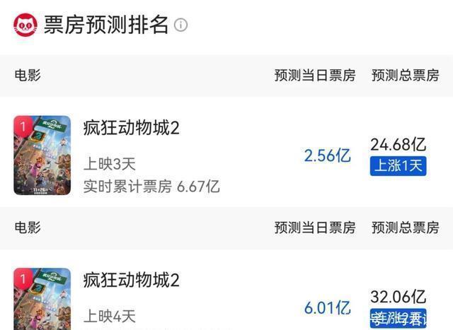 24亿调到32亿,当我觉得这会是平台的“毒奶”时,《荒诞动物城2》上映第4天的票房走势又猛到打我脸了!平台展望当日是6亿,可如今的动态展望已决骤至7亿了! 太猛了吧,让我好像又看到了《哪吒2》的大盘走势,按照《哪吒2》的大盘展望,《荒诞动物城2》至少能狂揽50亿票房吧。
