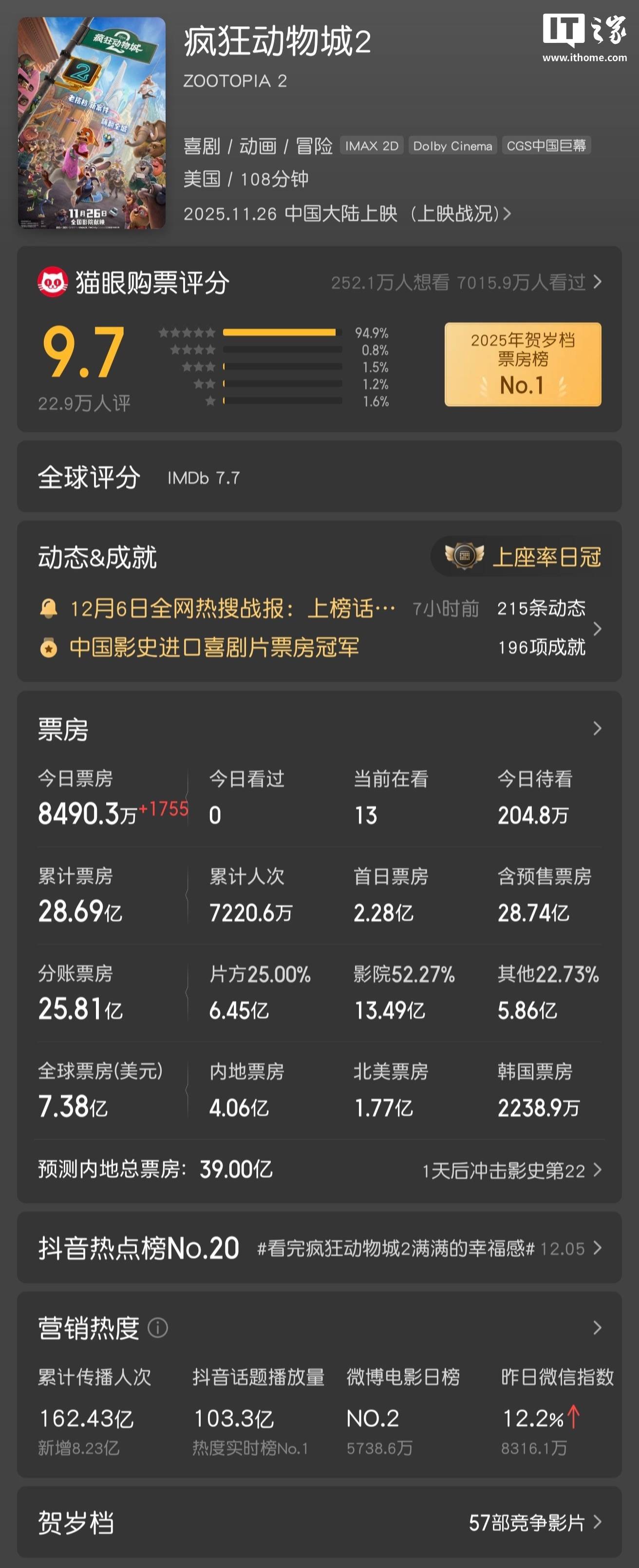 IT之家 12 月 7 日音问,据猫眼专科版,狂妄 12 月 7 日,迪士尼《荒诞动物城 2》上映 11 天累计票房已达 28.69 亿,跳跃《速率与感情 8》插足中国影史入口片票房前 2 名。