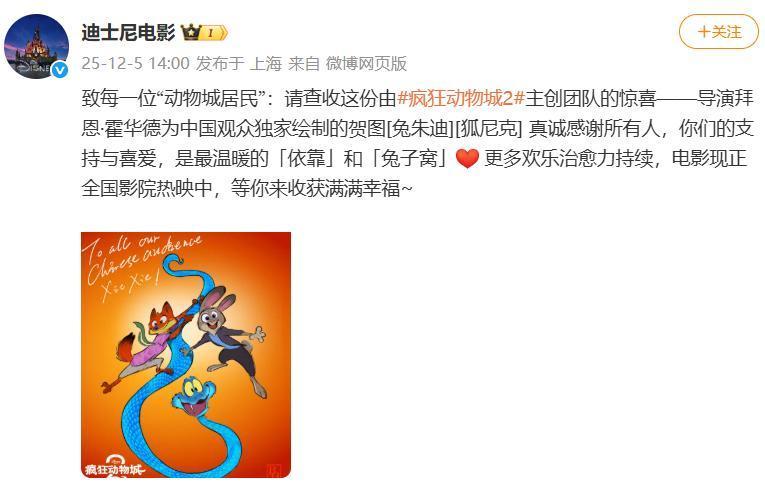 12月5日化州修车群,@迪士尼影业在酬酢平台晒图,称《纵容动物城2》导演拜恩·霍华德为中国不雅众独家画图了贺图,图中配文 “Xie Xie!”