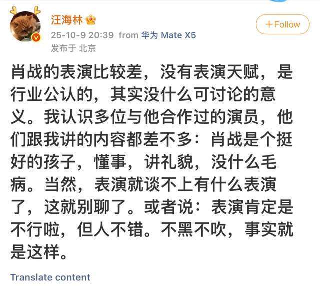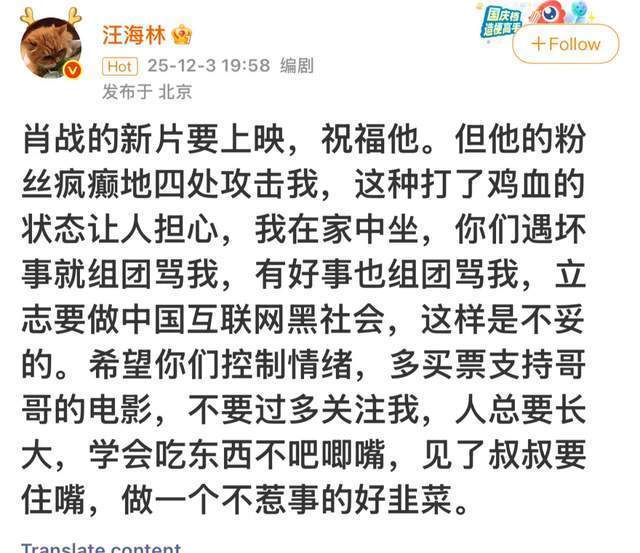 盛大的流量是一把双刃剑,它带来驻守,也带来尖刻的谛视。肖战从《陈情令》爆火于今,弥远方在公论的风口浪尖。这不,老店员编剧汪海林又又又坐不住了,之前就屡次公开品评其演技,但也承认他“东谈主可以、讲限定”。这回又先确定了肖战本东谈主,接着痛锤粉丝,和粉丝在互联网上情谊对线,心计包互殴开战。