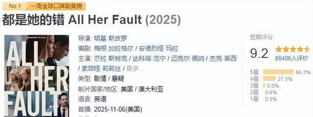 这部好意思剧名为《都是她的错》,外网口碑中规中矩,IMDb7.7,烂番茄极新度认证75%,但国内口碑不竭飙升,豆瓣评分一齐从9.0涨到9.2。