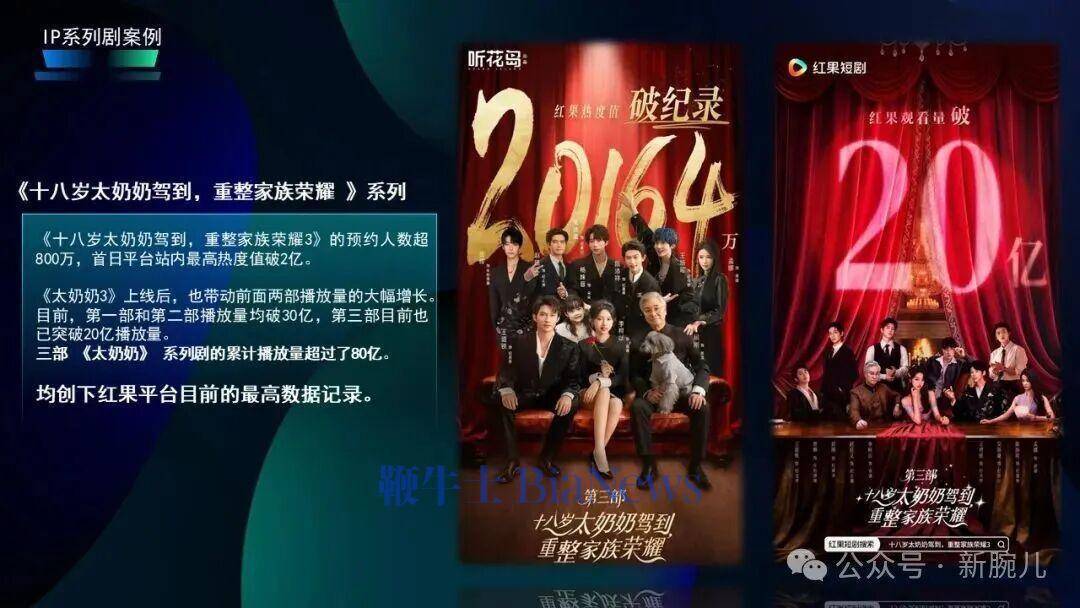 本年有好多IP系列剧,比如《云渺》以及《太奶奶系列》的《18岁太奶奶驾到,重整家眷荣耀3》刚刚也曾上线了,预约东说念主数突出了800万,《太奶奶系列3》上线之后,也带动了前两部的大幅度增长,当前《太奶奶1》和《太奶奶2》均也曾打破了30亿播放量,《太奶奶3》红果不雅看打破20亿,是以三部系列剧加强总播放量突出了80亿,这些数据均创下了当前红果平台的最高数据记载。