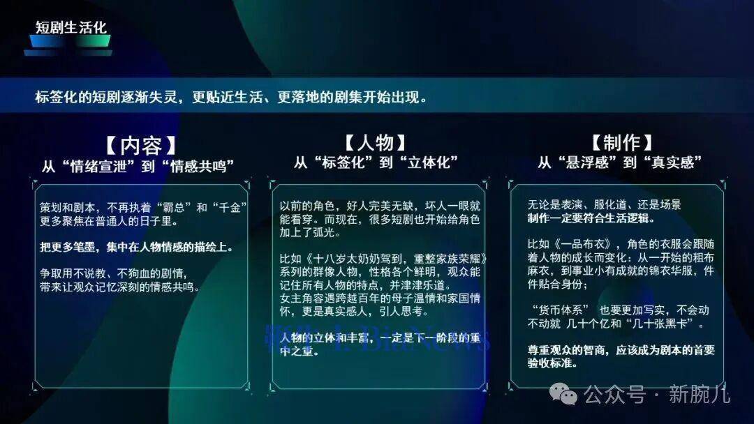 第二,亦然最进军的,应该聚焦在东说念主物,剧情的东说念主物应该从标签化过渡到立体化,昔时系数短剧好东说念主战争恢恢有余,邪派也相等昭着,一眼就不错看出是邪派,然则当前好多脚本里的变装加上了弧光,让东说念主物更立体,邪派不再是刻板印象中长得邪派和坏东说念主阿谁景色。