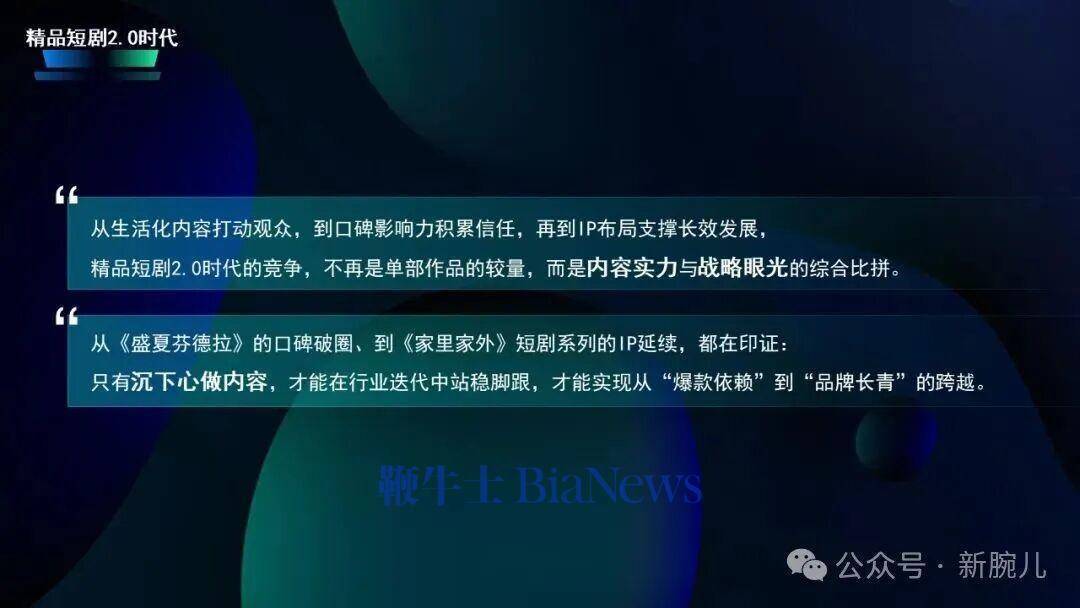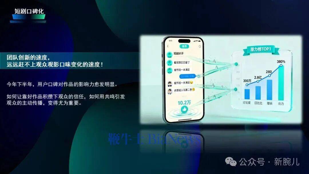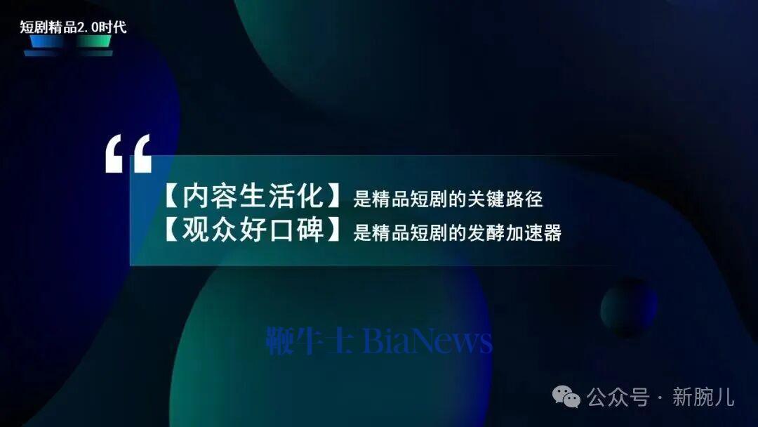 是以,我认为短剧的中枢竞争力一定不是标题党的剧情,而是不雅众看完之后当然保举给爸妈、保举给一又友,只消短巨变玉成球茶余饭后都筹议的话题,短剧行业才能开脱只火一部就莫得下文的短寿爆款魔咒,成为果然的可握续发展。