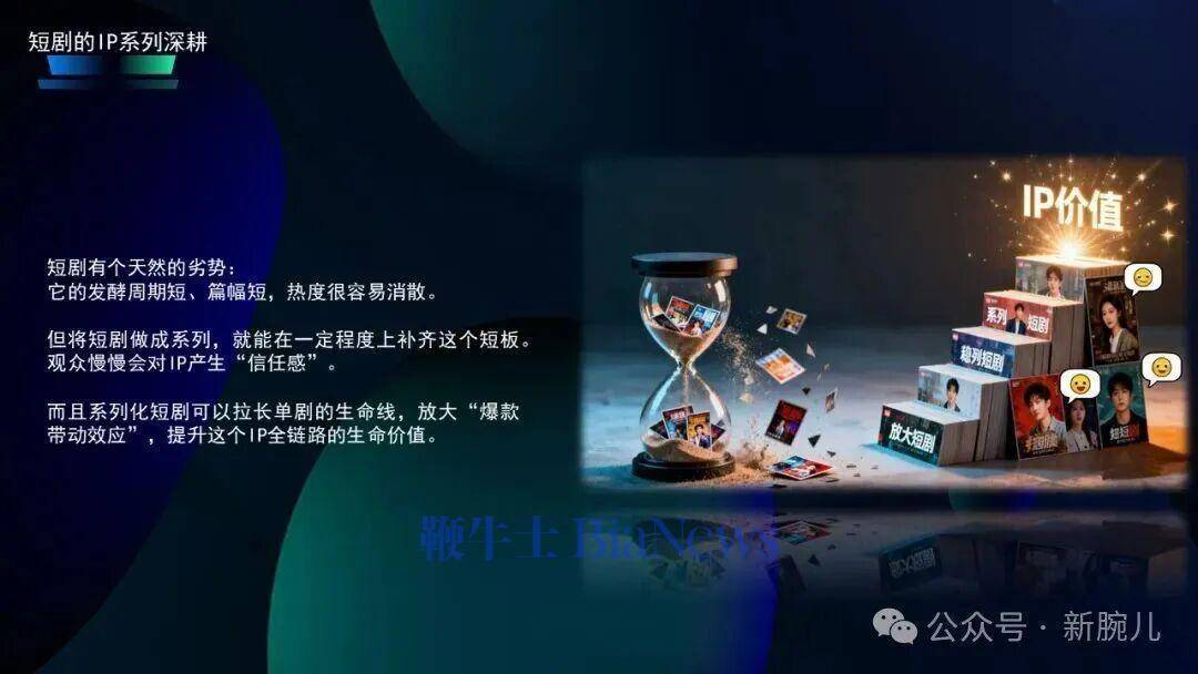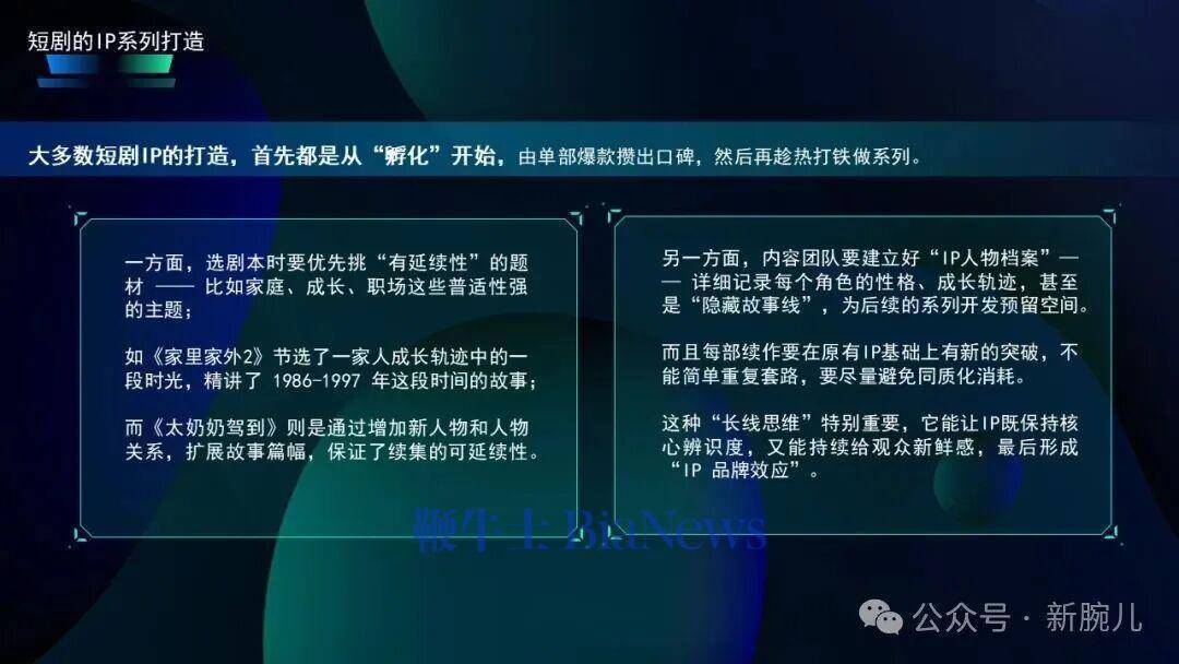 对杰作短剧来说,要作念IP系列化,一定要诞生东说念主物档案,详确记录每个东说念主物脾性、成长轨迹以及固定线,不错为后续系列开拓留住空间。何况每部续作一定要在原有IP上进行新的创作,弗成近似前边的套路,幸免短剧IP的同质化耗尽,这种长线念念维相等进军。它既不错让IP保握中枢辨识度,也要握续给不雅众崭新感,最终造成IP的品牌效应。