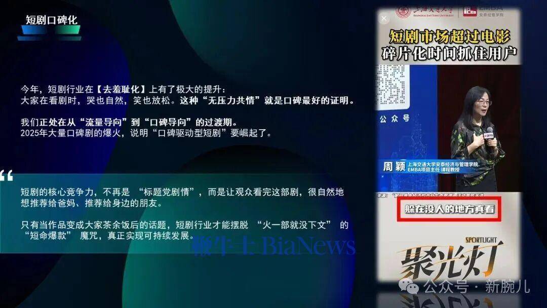 本年短剧行业在去玷辱化上有了很大的培植,前段本领我刷一个视频,上海交大一个涵养说他悄悄看短剧,他真的会躲在没东说念主的场地看,因为认为和全球聊短剧大致在公众局面看短剧会认为有点玷辱,本年看剧比拟旧年如故有很大的变化,笑也当然,哭也当然,这种无压力的共情便是口碑带来的最佳解说。当前咱们正在从流量导向过渡到口碑导向的时期,2025年有大量口碑短剧爆火,口碑驱动类型的短剧在缓缓崛起。
