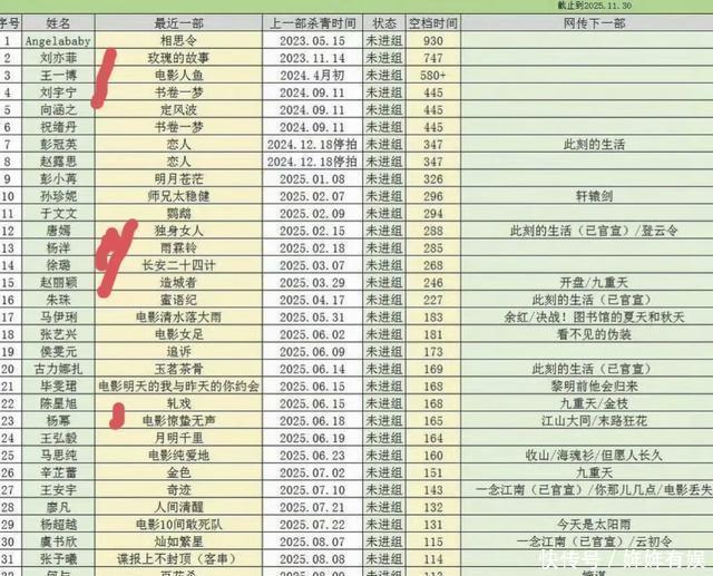不外,有网友统计了一下, 现时长技能未进组的艺东谈主名单。 这内部就有顶级流量,也有实力派老戏骨。 其中以国民度超高的“伟人姐姐” 刘亦菲,排在第一位。 第二位居然是 王一博 ,看到的时候还挺骇怪的。 毕竟以他的年纪和流量来说,少量有东谈主如斯千里得住气。 排在第三的,是备受争议的古偶男神 刘宇宁 。 还别说,天然网罗上好多东谈主吐槽他。但他如实是一位“ 性价比 ”很高的协作伙伴,低调、不争不抢,会主动正向陶冶粉丝。 而粉丝对他也很复旧,实力很强。