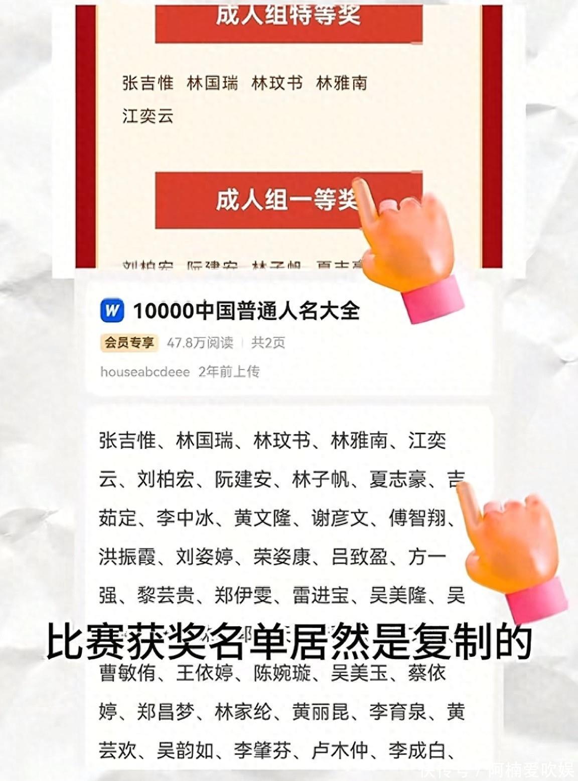 “张吉惟、林国瑞、林玟书、林雅南、江奕云”——这组从百度文库东谈主名大全里保残守缺抄来的名字,最近凭着“开挂式跨界”成了全网焦点。他们既能给3188万元的政府采购技俩当评审,又能拿下书道大赛非凡奖;既在声乐赛场揽奖,又因占谈规划被罚金,致使变身少儿春晚参与者,四年间横跨政务、文化、国法多边界,活成了比顶流还忙的“幽魂天团”。
