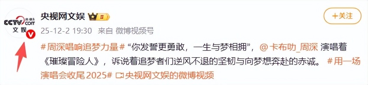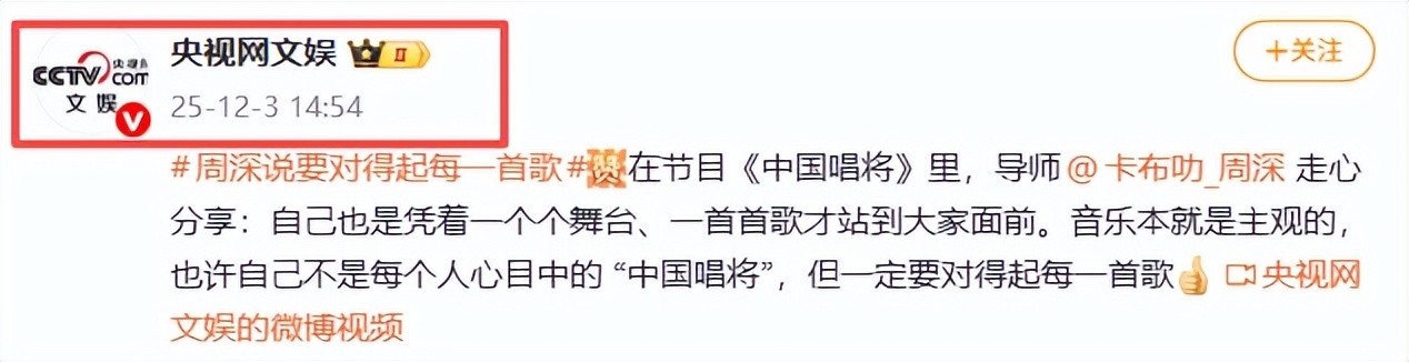 76. 12月2日当天,央视网娱乐初次发布动态,高度评价周深。