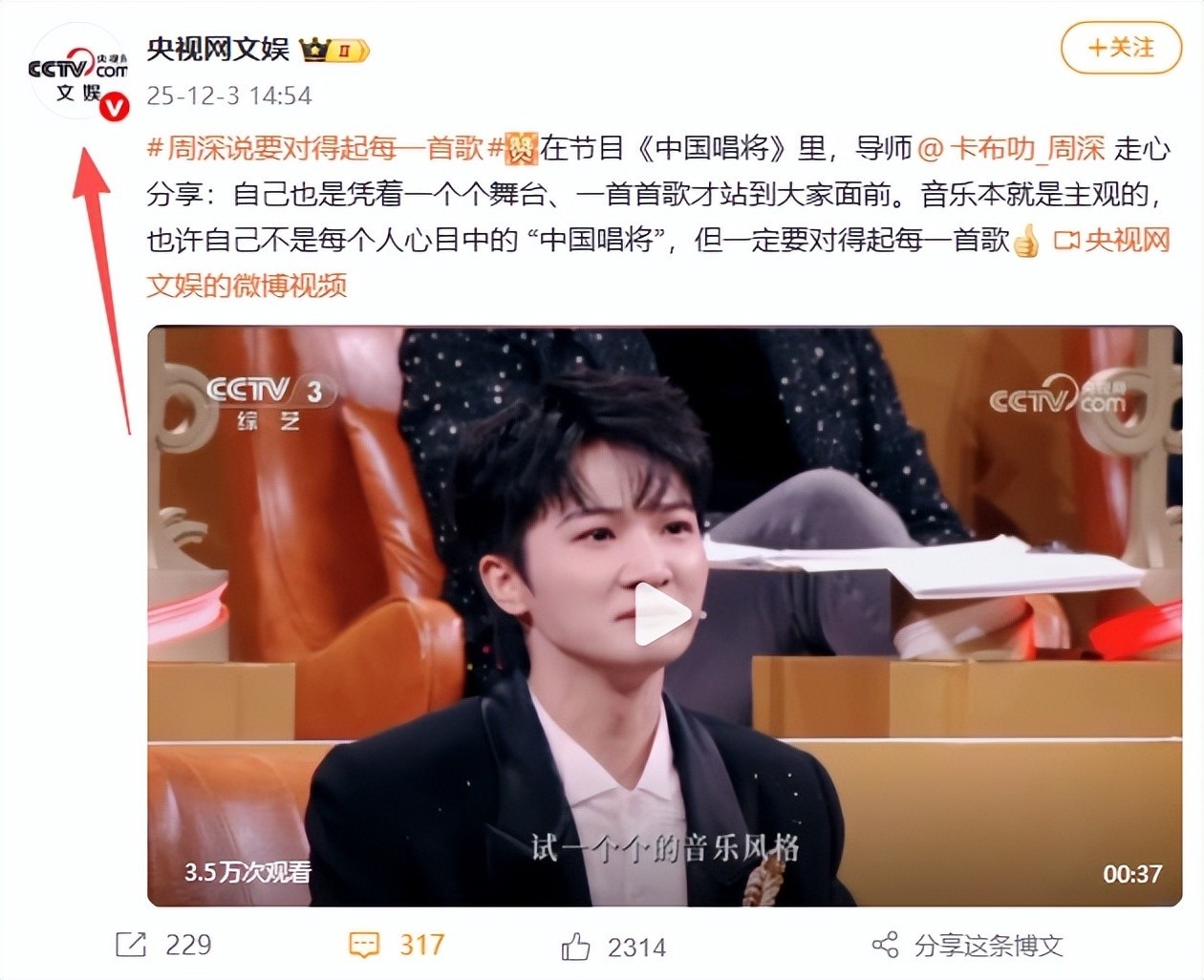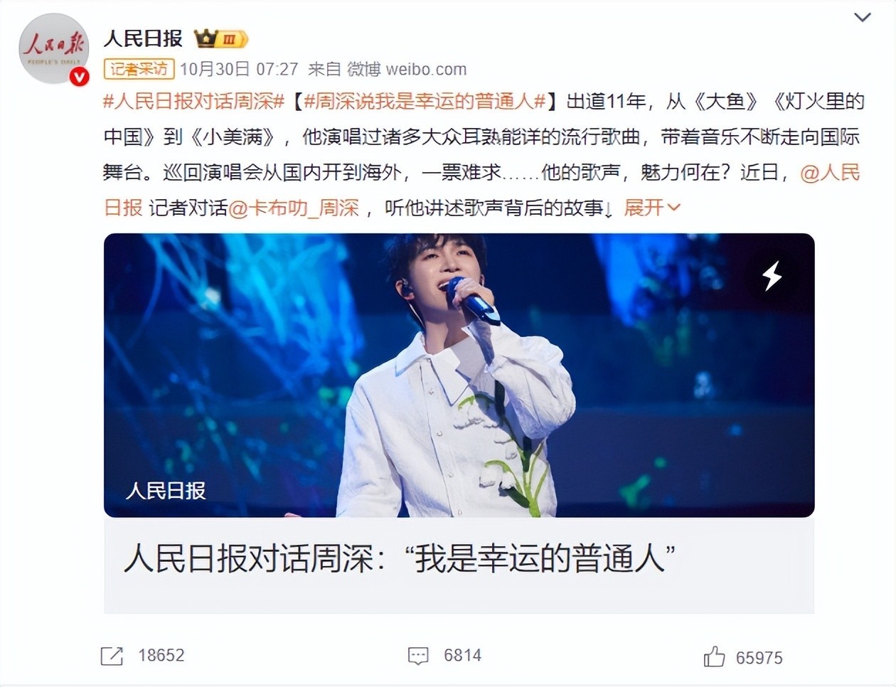 9. 就在最近不到一天的期间里,中央级媒体联接两次公开点赞周深。