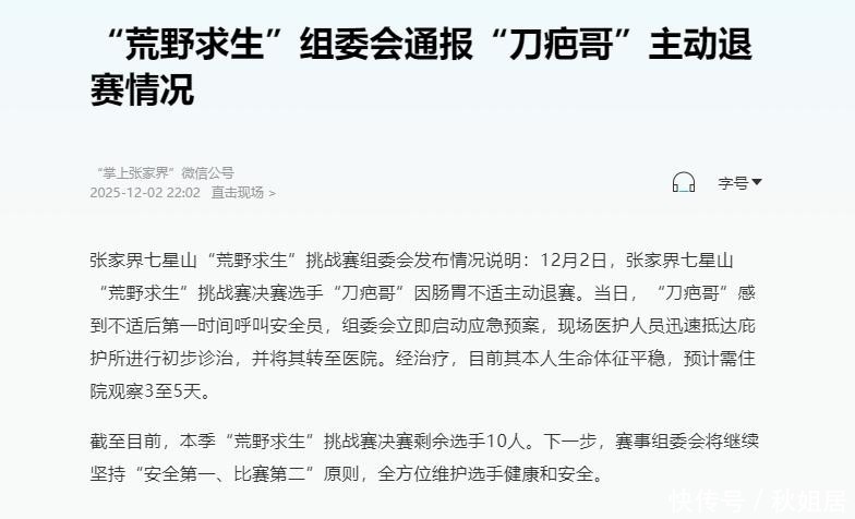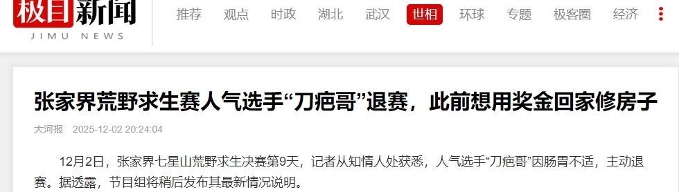 【参考文件】1.新京报-2025年12月2日——《七星山“萧索求生”挑战赛“刀疤哥”肠胃不适退赛》2.滂湃新闻-2025年12月2日——《“萧索求生”组委和会报“刀疤哥”主动退赛情况》3.极目新闻-2025年12月2日——《张家界萧索求生赛东说念主气选手“刀疤哥”退赛,此前念念用奖金回家修屋子》
