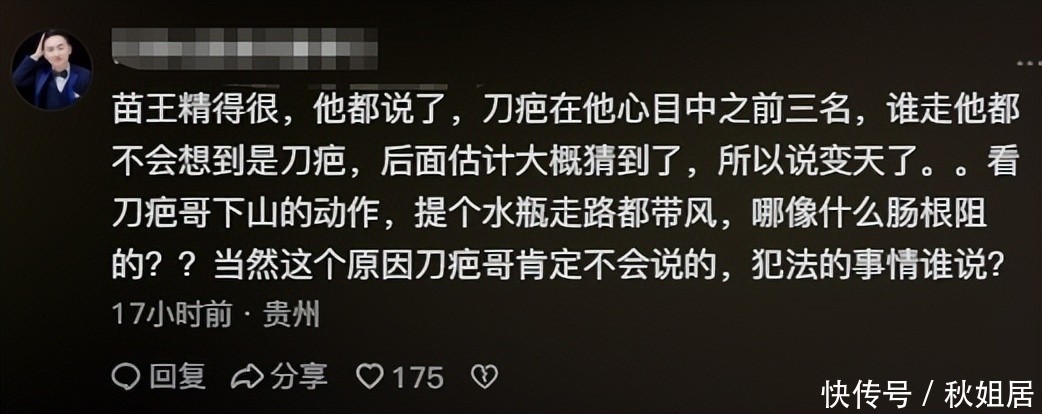 18. 刀疤哥本东说念主发布的告别视频中,主意昏黑,口吻低千里地表示:“我很不承诺,是大夫让我下来的,我我方并不念念走。”